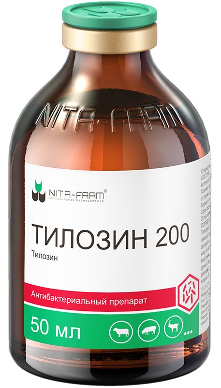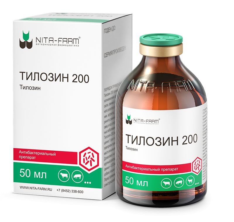 Тилозин 200 ― растворов для инъекций, оригинальное запатентованное антибактериальное лекарственное средство в форме раствора для инъекций для лечения крупного и мелкого рогатого скота, свиней, собак и кошек при заболеваниях бактериальной и микоплазменной этиологии.