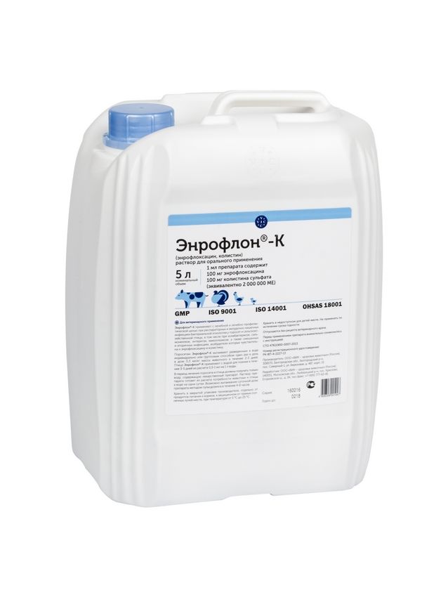 При пероральном введении Энрофлона®-К энрофлоксацин быстро всасывается в желудочно-кишечном тракте и проникает во все органы и ткани животных. Максимальная концентрация энрофлоксацина в крови достигается через 1-2 часа после применения препарата. Колистина сульфат относительно плохо всасывается и оказывает свое антимикробное действие непосредственно в кишечнике.