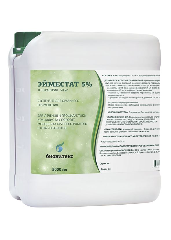 ЭЙМЕСТАТ 5% - антикокцидийный препарат для лечения и профилактики кокцидиоза у поросят, молодняка крупного рогатого скота и кроликов. Толтразурил, входящий в состав лекарственного препарата это синтетическое вещество, которое относится к группе триазинтриона, обладает широким спектром антикокцидийного действия и высокой степенью безопасности. Толтразурил эффективен в отношении всех видов паразитирующих кокцидий, у свиней и крупного рогатого скота, на стадиях внутриклеточного развития паразитов, включая Isospora suis, Е. arloingi, Eimeria scabra, E. guevarai. E. bovis, E. zuernii, E. alabamensis, а гак же эймерий кроликов Е. stiedae, E.intestinalis, E.magna, E. media, E. calcicola, E. irresidua, E. perforans, E.piriformis, в том числе штаммов, резистентных к другим антикокцидийным препаратам.