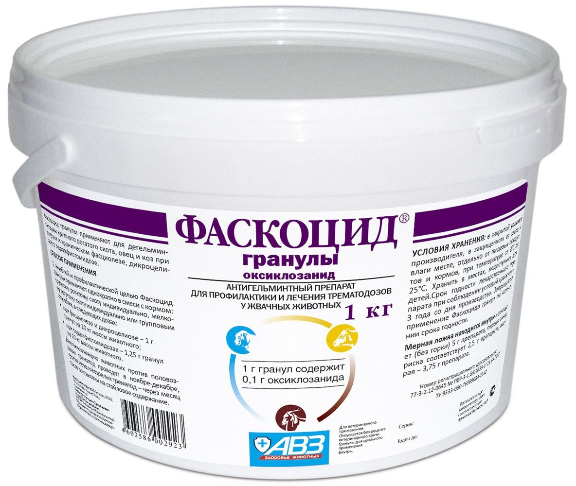 Содержит в качестве действующего вещества оксиклозанид. «Фаскоцид» гранулы выпускается в пакетах из многослойной бумаги по 0,5 кг, в полимерных банках по 1 кг. «Фаскоцид» таблетки – по 100 штук в картонных коробках.