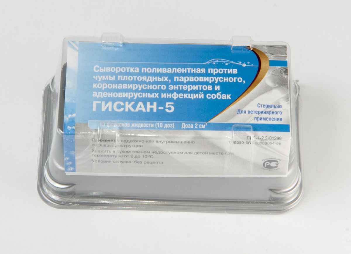 Сыворотка Гискан-5 -это биопрепарат на основе сыворотки крови крупного рогатого скота (или мелкого рогатого скота, лошадей) содержащей специфические антитела к вирусам чумы плотоядных, парвовируса, коронавируса и аденовирусов собак. По внешнему виду препарат представляет собой слегка опалесцирующую жидкость желтоватого или желтовато-коричневого цвета, при хранении которого допускается образование незначительного осадка, исчезающего при встряхивании флакона. Сыворотку расфасовывают во флаконах по 2 мл (1 доза), упакованных по 10 штук в пластиковую коробку.