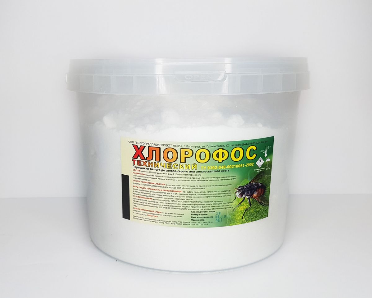 ХЛОРОФОС ТЕХНИЧЕCКИЙ представляет собой белый кристаллический порошок, содержащий не менее 97% основного вещества.