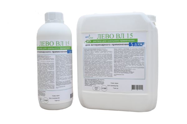 15. Лево ВЛ 15 применяется перорально индивидуально или групповым способом с водой для поения свиньям и птице в дозе 1,0 мл на 20 кг массы животного (7,5 мг левофлоксацина на 1 кг массы животного), ежедневно в течение 3-5 дней.