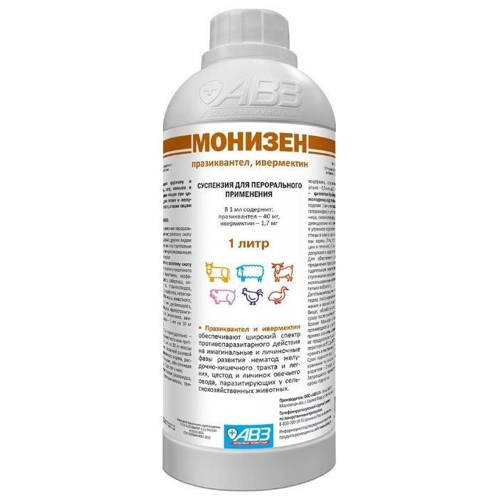 Крупному рогатому скоту, овцам и козам Монизен применяют при нематодозах желудочно-кишечного тракта (гемонхоз, буностомоз, эзофагостомоз, нематодироз, хабертиоз, коопериоз, остертагиоз, стронгилоидоз, трихостронгилез, трихоцефалез, неоаскариоз) в дозе 1 мл на 20 кг массы животного, при нематодозах легких (диктиокаулез, мюлле¬риоз, цистокаулез, протостронгилез) и цестодозах (мониезиоз, авителлиноз, тизаниезиоз) индивидуально в дозе 1 мл на 10 кг массы животного.