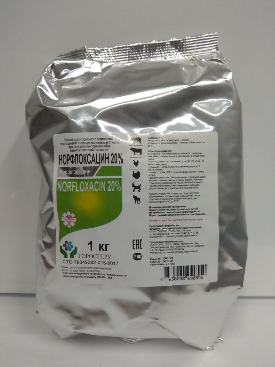 3.1 Норфлоксацин 20% применяют сельскохозяйственным животным и птице в качестве лечебно-профилактического средства при колибактериозе, пастереллезе, сальмонеллезе, микоплазмозе, стафилококковой инфекции, гемофилезе и других заболеваниях.