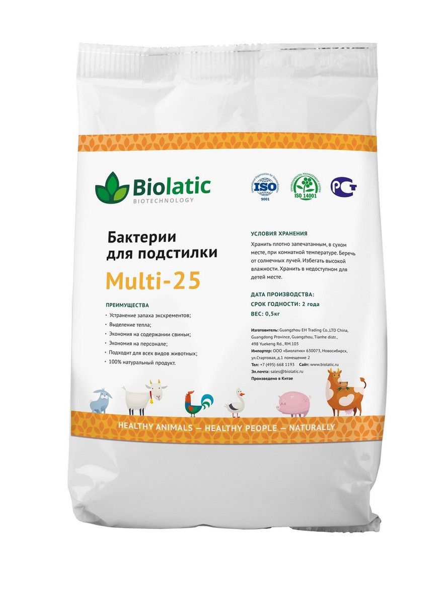 Специальные экологически чистые бактерии по улучшенной технологии Multi-25, которые добавляют в подстилку для животных. Полезные микроорганизмы выделяют тепло, перерабатывают экскременты и нейтрализуют неприятный запах. Продукт без гормонов и антибиотиков, поэтому укрепляет иммунитет птицы и скота. Multi-25 отлично зарекомендовал себя в условиях России.