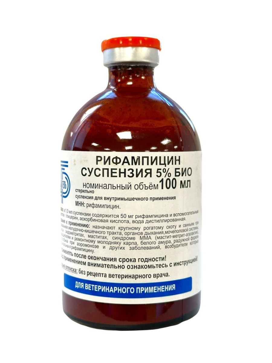 Убой на мясо животных и рыб, которым применяли рифампицин, разрешается не ранее, чем через 5 суток после прекращения введения препарата. Мясо животных и рыбы, вынужденно убитых до истечения указанного срока, используют в корм плотоядным. Молоко от коров, подвергающихся лечению рифампицином, и в период 72 часа с момента последнего введения препарата скармливают животным после кипячения.