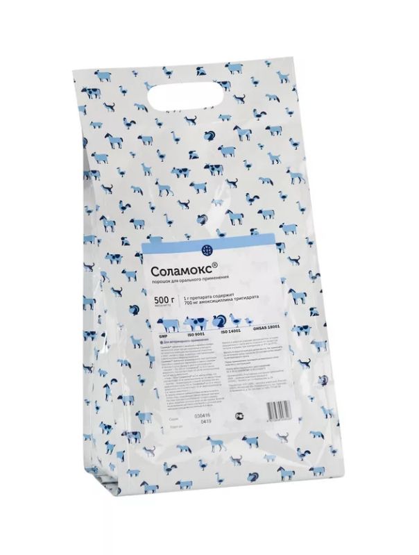 СОЛАМОКС® содержит в 1 г в качестве действующего вещества 700 мг амоксициллина тригидрата, а в качестве вспомогательных веществ 270 мг карбоната натрия, 20 мг глицина и 10 мг трилона Б. По внешнему виду СОЛАМОКС® представляет собой порошок белого цвета. СОЛАМОКС® выпускают расфасованным по 100, 500, 1000, 5000 и 10000 г в пакетах из бумаги с полиэтиленовым покрытием, или в двойных пакетах из полиэтиленовой пленки, или в пакетах из металлизированной полиэтиленовой пленки, или в пластиковых банках соответствующей вместимости.