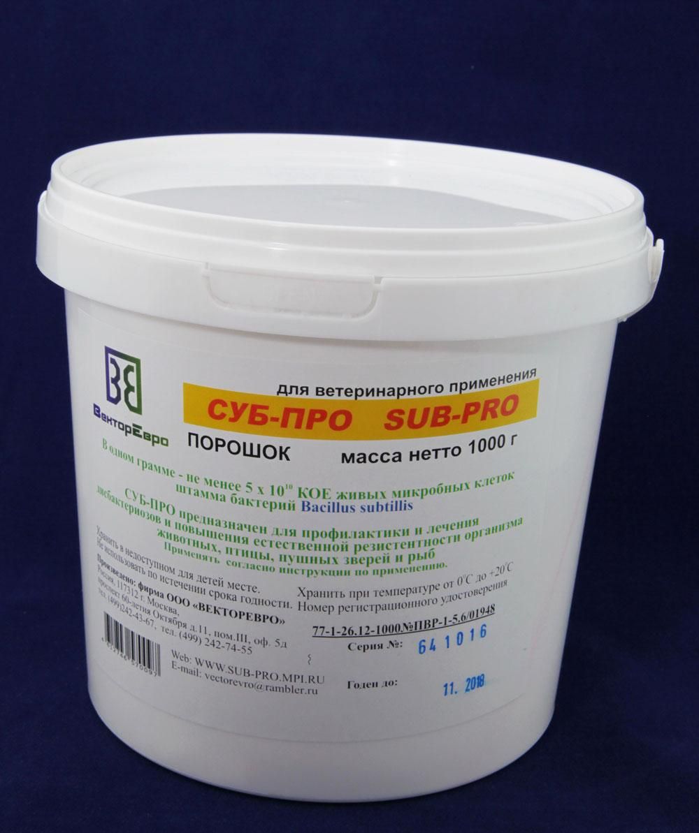 СУБ-ПРО обладает высокой устойчивостью к пищеварительным сокам и ферментам желудочно-кишечного тракта и оказывает антитоксическое и иммуномодулирующее действие, обусловленное выработкой пептидогликанов, тейхоевых и липотейхоевых кислот, при этом не вызывает дисбактериозов, и рост нормальной микрофлоры кишечника не подавляется. СУБ-ПРО повышает общую резистентную активность, нормализует кишечную микрофлору и обменные процессы в организме, а также обладает антивирусной активностью за счет вырабатываемого эндогенного интерферона в количествах, обеспечивающих противовирусную защиту животных.