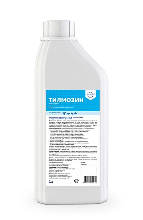 Сельскохозяйственной птице– групповым способом в суточной дозе 300 мл Тилмозина на 1000 л воды (75 мг тилмикозина на 1 л воды) или 0,6-0,8 мл препарата на 10 кг массы птиц (15-20 мг тилмикозина на 1 кг) в течение 3-5 дней;