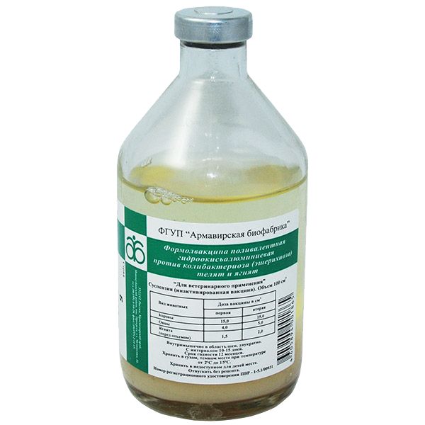 первый вариант содержит эширихии серогрупп — 08, 09, 0138, 0139, 078, 0141, 0147, 0149 — предназначен для профилактики колибактериоза свиноматок и поросят; второй вариант содержит эширихии серогрупп — 08, 09, 015, 020, 026, 041, 055, 078, 086, 0101, 0115, 0117, 0119 — предназначен для профилактики колибактериоза стельных коров и нетелей, суягных овец и ягнят.