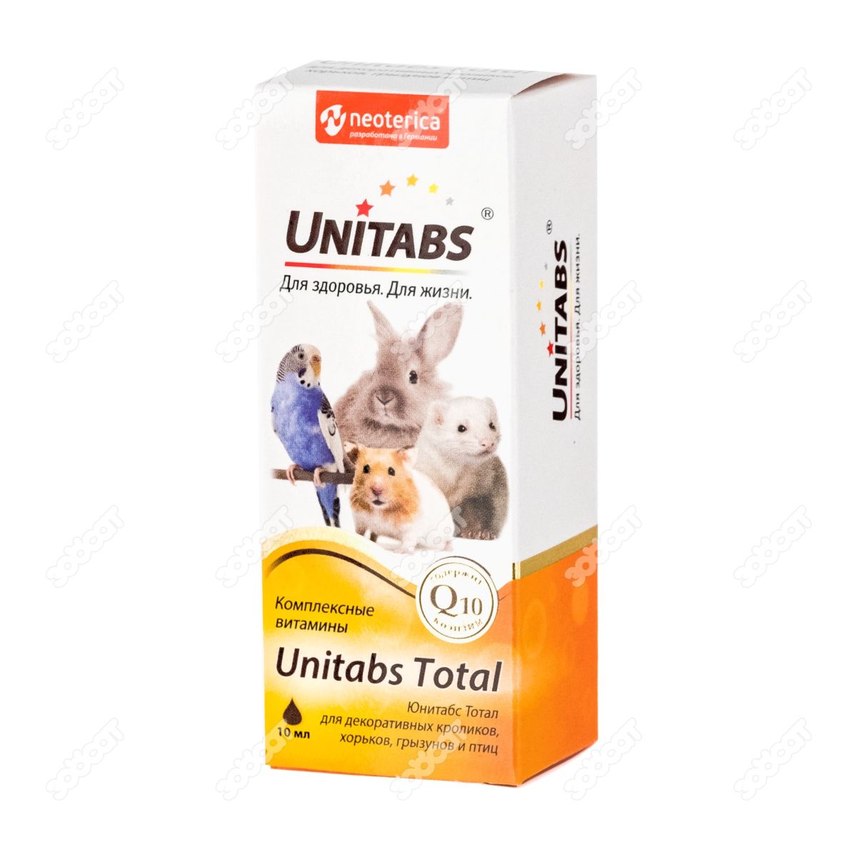 Unitabs Total — это витаминный комплекс для птиц и грызунов, который содержит коэнзим Q10 и все необходимые витамины для улучшения состояния кожи, шерсти, оперения и иммунитета питомца.